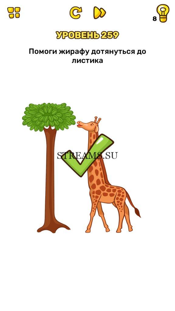 Помоги жирафу дотянуться до листика. Уровень 259 — Brain Blow: Тест на гениальность — Ответ на этот уровень находится под фото. Очередная игра от популярных разработчиков головоломок CASUAL AZUR GAMES. Если вы хотите взорвать свой мозг и развить навыки нестандартного мышления, тогда игра Брейн Блоу определенно вам понравится. Если не получается решить задание, то попробуйте включить нестандартное мышление, тряхнуть телефон, погладить его или использовать больше пальцев. Эта игра способна развить в вас навыки следопыта, креативность и прокачать ваш IQ. Но, а если все-же не получается пройти уровень, найдите правильное решение на нашем сайте.
