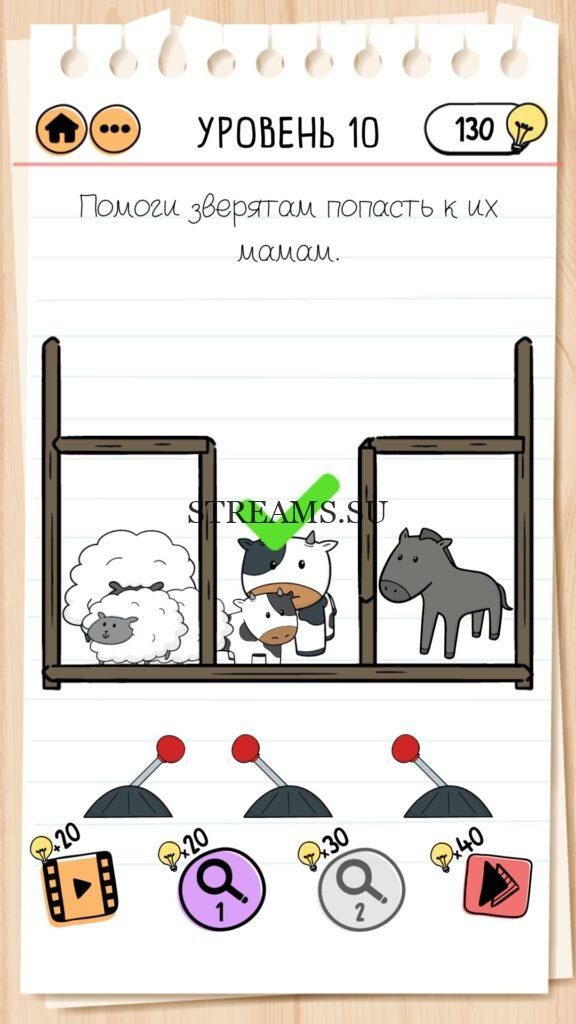 Помоги зверям попасть к их мамам. Уровень 10 — Brain Test 2 (Женина ферма): Вторая часть замечательной игры уже здесь. Готовы к испытанию своего мозга на прочность? Тогда смело залетайте в эту головоломку. Здесь нас ждет непредсказуемые задачки, вопросы и головоломки, которые сразу и не получиться решить. Будьте готовы к вопросам с подвохом! Попробуйте решить все уровни. Эта головоломка построена по принципу историй. В каждой истории придется помогать кому-то решить бытовые вопросы; вычислить преступника; помочь похудеть. Это лишь некоторые эпизоды которые нас ожидают в этой игре. Очень красочная игра, которая понравится и вам и вашим друзьям. Если не получается пройти загадку, то на нашем сайте STREAMS.SU вы найдете решение любого уровня Brain Test 2!