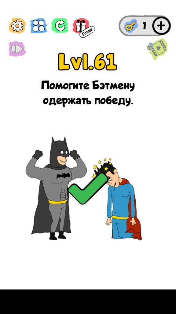 Помогите Бэтмену одержать победу. 61 уровень Trick Me: логические головоломки — Это игра созданная в виде викторины. Каждый новый уровень отличается от предыдущего, что делает игровой процесс затягивающим и интересным. Если ты хочешь узнать насколько ты умный, тогда эта игра точно для тебя! Trick Me поможет тебе развить нестандартное мышление, и повысить свой IQ. В этой игре уже есть 236 уровней, которые постоянно обновляются и пополняются. Но если застрял на одном или нескольких уровнях, и не можешь их пройти, то наш сайт придет на помощь, у нас есть все ответы на уровни игры Trick Me.