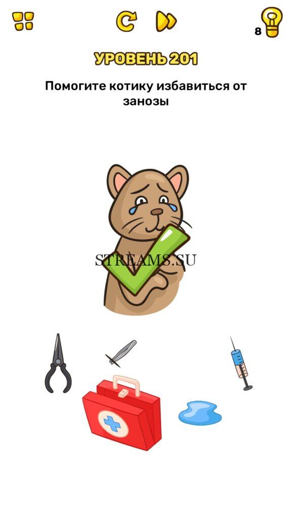 Помогите котику избавиться от занозы. Уровень 201 — Brain Blow: Тест на гениальность — Ответ на этот уровень находится под фото. Очередная игра от популярных разработчиков головоломок CASUAL AZUR GAMES. Если вы хотите взорвать свой мозг и развить навыки нестандартного мышления, тогда игра Брейн Блоу определенно вам понравится. Если не получается решить задание, то попробуйте включить нестандартное мышление, тряхнуть телефон, погладить его или использовать больше пальцев. Эта игра способна развить в вас навыки следопыта, креативность и прокачать ваш IQ. Но, а если все-же не получается пройти уровень, найдите правильное решение на нашем сайте.