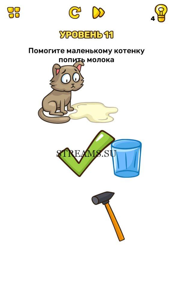 Помогите маленькому котенку попить молока. Уровень 11 — Brain Blow: Тест на гениальность — Ответ на этот уровень находится под фото. Очередная игра от популярных разработчиков головоломок CASUAL AZUR GAMES. Если вы хотите взорвать свой мозг и развить навыки нестандартного мышления, тогда игра Брейн Блоу определенно вам понравится. Если не получается решить задание, то попробуйте включить нестандартное мышление, тряхнуть телефон, погладить его или использовать больше пальцев. Эта игра способна развить в вас навыки следопыта, креативность и прокачать ваш IQ. Но, а если все-же не получается пройти уровень, найдите правильное решение на нашем сайте.
