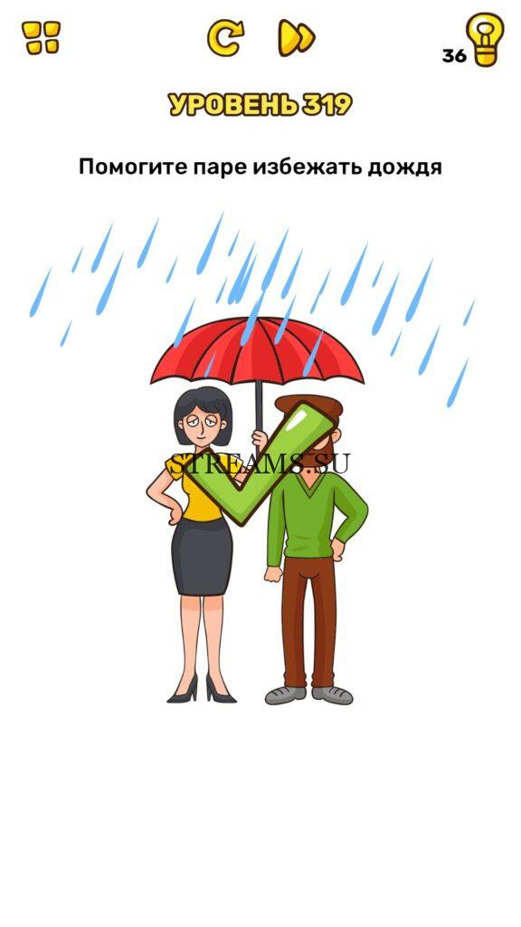 Помогите паре избежать дождя. Уровень 319 — Brain Blow: Тест на гениальность — Ответ на этот уровень находится под фото. Очередная игра от популярных разработчиков головоломок CASUAL AZUR GAMES. Если вы хотите взорвать свой мозг и развить навыки нестандартного мышления, тогда игра Брейн Блоу определенно вам понравится. Если не получается решить задание, то попробуйте включить нестандартное мышление, тряхнуть телефон, погладить его или использовать больше пальцев. Эта игра способна развить в вас навыки следопыта, креативность и прокачать ваш IQ. Но, а если все-же не получается пройти уровень, найдите правильное решение на нашем сайте.