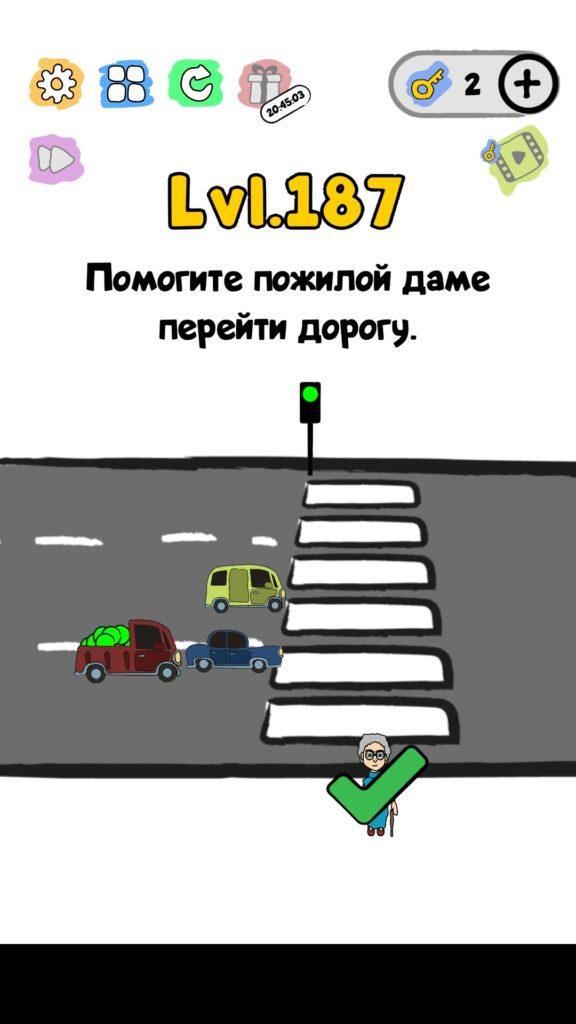Помогите пожилой даме перейти дорогу. 187 уровень Trick Me: логические головоломки — Это игра созданная в виде викторины. Каждый новый уровень отличается от предыдущего, что делает игровой процесс затягивающим и интересным. Если ты хочешь узнать насколько ты умный, тогда эта игра точно для тебя! Trick Me поможет тебе развить нестандартное мышление, и повысить свой IQ. В этой игре уже есть 236 уровней, которые постоянно обновляются и пополняются. Но если застрял на одном или нескольких уровнях, и не можешь их пройти, то наш сайт придет на помощь, у нас есть все ответы на уровни игры Trick Me.