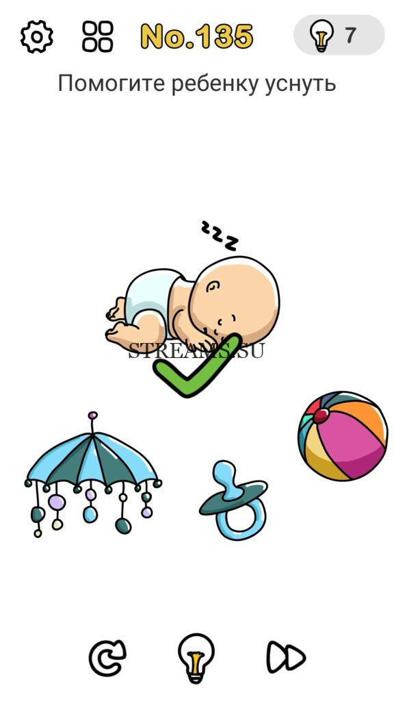 Помогите ребенку уснуть. Уровень 135 — Brain Out: Ответ на этот уровень находится чуть ниже. Всегда было интересно узнать каков твой IQ? Эта игра поможет тебе узнать ответ на этот вопрос! В ней встречаются как логические загадки, так и не очень. С помощью этой интересной головоломки вы сможете развить нестандартное мышление, креативность, воображение а также улучшить способность запоминать. Некоторые решения задач, могут показаться абсурдными. Играйте в Brain Out с друзьями и родственниками. А если у вас не получается пройти один или несколько уровней, вы можете воспользоваться подсказками с нашего сайта.