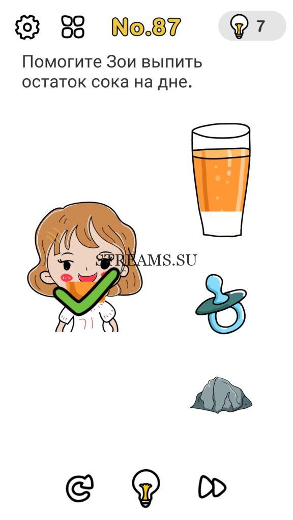 Помогите Зои выпить остаток сока на дне. Уровень 87 — Brain Out: Ответ на этот уровень находится чуть ниже. Всегда было интересно узнать каков твой IQ? Эта игра поможет тебе узнать ответ на этот вопрос! В ней встречаются как логические загадки, так и не очень. С помощью этой интересной головоломки вы сможете развить нестандартное мышление, креативность, воображение а также улучшить способность запоминать. Некоторые решения задач, могут показаться абсурдными. Играйте в Brain Out с друзьями и родственниками. А если у вас не получается пройти один или несколько уровней, вы можете воспользоваться подсказками с нашего сайта.