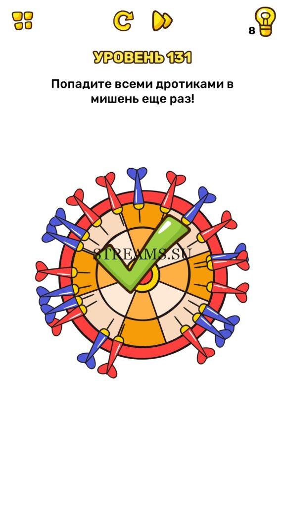 Попадите всеми дротиками в мишень ещё раз! Уровень 131 — Brain Blow: Тест на гениальность — Ответ на этот уровень находится под фото. Очередная игра от популярных разработчиков головоломок CASUAL AZUR GAMES. Если вы хотите взорвать свой мозг и развить навыки нестандартного мышления, тогда игра Брейн Блоу определенно вам понравится. Если не получается решить задание, то попробуйте включить нестандартное мышление, тряхнуть телефон, погладить его или использовать больше пальцев. Эта игра способна развить в вас навыки следопыта, креативность и прокачать ваш IQ. Но, а если все-же не получается пройти уровень, найдите правильное решение на нашем сайте.