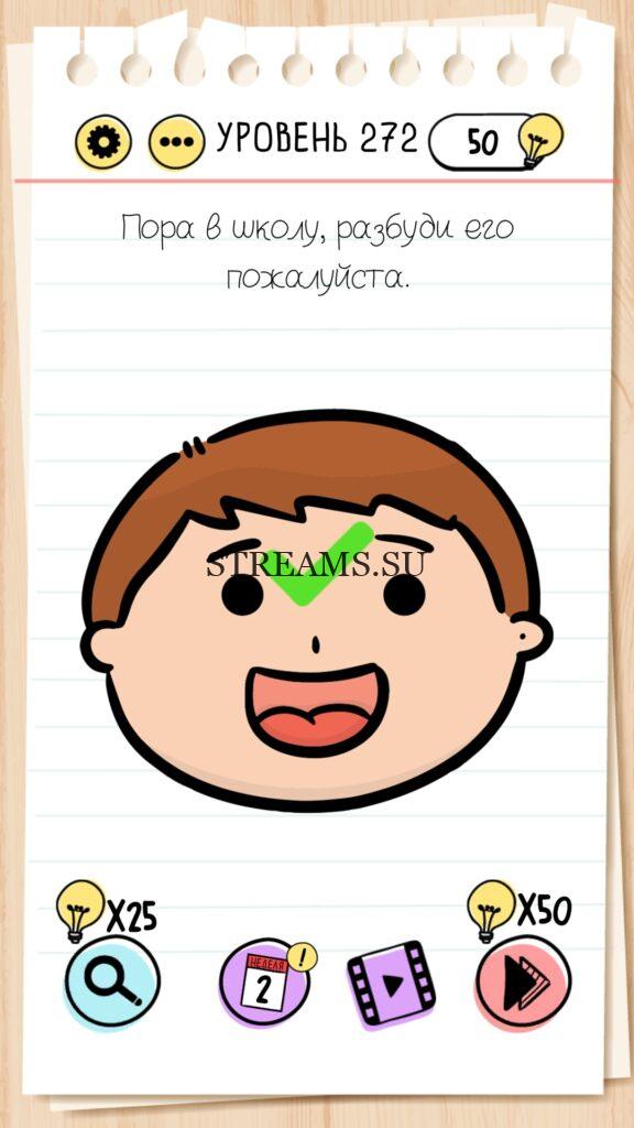 Пора в школу, разбуди его пожалуйста. Уровень 272 — Brain Test — Это самая популярная головоломка, в которой вам предстоит разгадывать непростые задачки. Нужно будет искать нестандартные решения. Название игры говорит само за себя (Тест мозга). С её помощью вы сможете повысить свой IQ, и интеллект. Иногда ответ может быть очень прост. Вы можете играть в компании друзей или родных. Брейн Тест, это отличный способ провести время с пользой и узнать насколько ты умный. Но если вы не можете решить один или несколько уровней, то воспользуйтесь подсказками с нашего сайта.