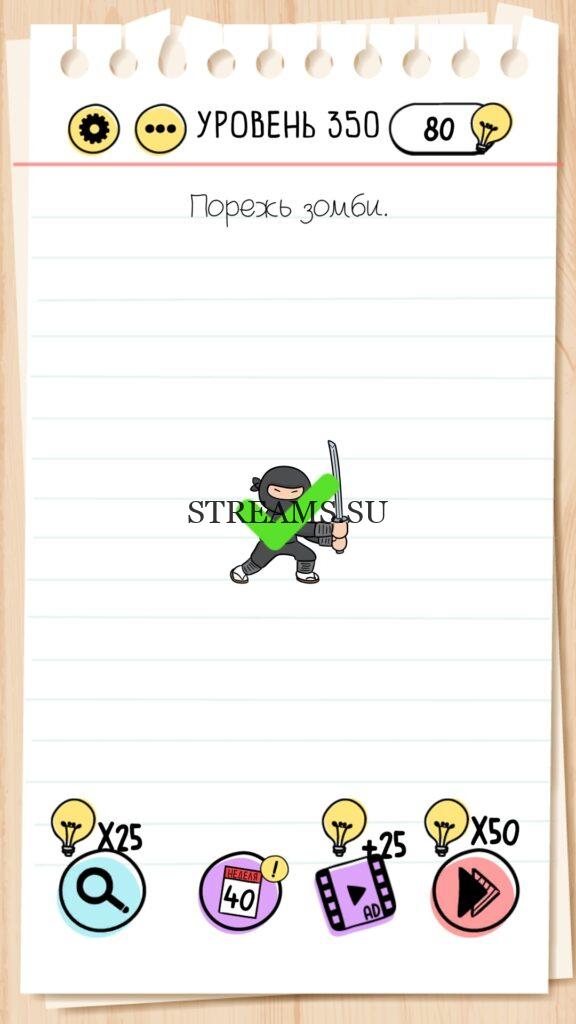 Порежь зомби. Уровень 350 — Brain Test — Это самая популярная головоломка, в которой вам предстоит разгадывать непростые задачки. Нужно будет искать нестандартные решения. Название игры говорит само за себя (Тест мозга). С её помощью вы сможете повысить свой IQ, и интеллект. Иногда ответ может быть очень прост. Вы можете играть в компании друзей или родных. Брейн Тест, это отличный способ провести время с пользой и узнать насколько ты умный. Но если вы не можете решить один или несколько уровней, то воспользуйтесь подсказками с нашего сайта.