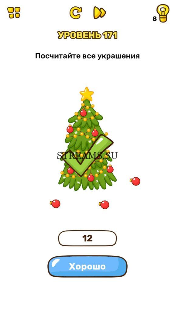 Посчитайте все украшения. Уровень 171 — Brain Blow: Тест на гениальность — Ответ на этот уровень находится под фото. Очередная игра от популярных разработчиков головоломок CASUAL AZUR GAMES. Если вы хотите взорвать свой мозг и развить навыки нестандартного мышления, тогда игра Брейн Блоу определенно вам понравится. Если не получается решить задание, то попробуйте включить нестандартное мышление, тряхнуть телефон, погладить его или использовать больше пальцев. Эта игра способна развить в вас навыки следопыта, креативность и прокачать ваш IQ. Но, а если все-же не получается пройти уровень, найдите правильное решение на нашем сайте.