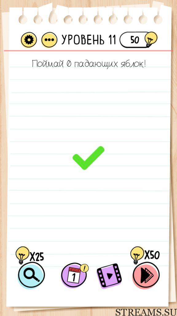 Поймай 5 падающих яблок! Уровень 11 — Brain Test — Это самая популярная головоломка, в которой вам предстоит разгадывать непростые задачки. Нужно будет искать нестандартные решения. Название игры говорит само за себя (Тест мозга). С её помощью вы сможете повысить свой IQ, и интеллект. Иногда ответ может быть очень прост. Вы можете играть в компании друзей или родных. Брейн Тест, это отличный способ провести время с пользой и узнать насколько ты умный. Но если вы не можете решить один или несколько уровней, то воспользуйтесь подсказками с нашего сайта.