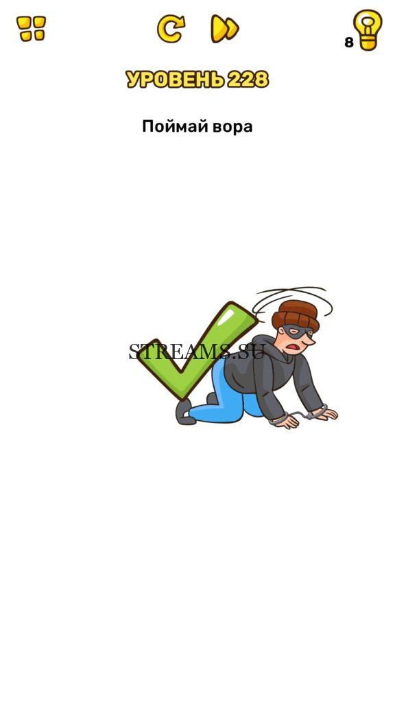 Поймай вора. Уровень 228 — Brain Blow: Тест на гениальность — Ответ на этот уровень находится под фото. Очередная игра от популярных разработчиков головоломок CASUAL AZUR GAMES. Если вы хотите взорвать свой мозг и развить навыки нестандартного мышления, тогда игра Брейн Блоу определенно вам понравится. Если не получается решить задание, то попробуйте включить нестандартное мышление, тряхнуть телефон, погладить его или использовать больше пальцев. Эта игра способна развить в вас навыки следопыта, креативность и прокачать ваш IQ. Но, а если все-же не получается пройти уровень, найдите правильное решение на нашем сайте.