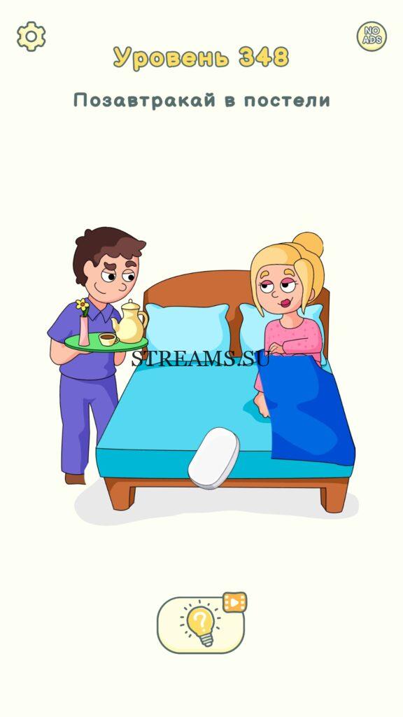 Позавтракай в постели. Уровень 348 — DOP 2: Delete One Part. Вы готовы к продолжению первой части игры? Тогда вперед! Эта игра DOP 2 (Расшифровка: Delete One Part) , которая отличается от первой части тем, что здесь нам нужно будет не дорисовывать предметы, а удалять или стирать их. Вас ждет множество хитроумных и интересных уровней. На первом этапе нам будут подсказывать, что нужно удали, но потом становится всё тяжелее и тяжелее решать головоломки. Разработчики постарались сделать игру привлекательной. Геймплей заставит вас просидеть за игрой очень долго. Красивая графика исполнения. Тренировка мозга и многое другое, всё это ждет нас в замечательной головоломке DOP 2. Если не получается пройти уровень, или зашли в тупик, то вы можете найти ответ на любой уровень на нашем сайте STREAMS.SU! Ответ на этот уровень находиться чуть ниже..