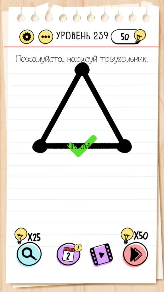 Пожалуйста нарисуй треугольник. Уровень 239 — Brain Test — Это самая популярная головоломка, в которой вам предстоит разгадывать непростые задачки. Нужно будет искать нестандартные решения. Название игры говорит само за себя (Тест мозга). С её помощью вы сможете повысить свой IQ, и интеллект. Иногда ответ может быть очень прост. Вы можете играть в компании друзей или родных. Брейн Тест, это отличный способ провести время с пользой и узнать насколько ты умный. Но если вы не можете решить один или несколько уровней, то воспользуйтесь подсказками с нашего сайта.