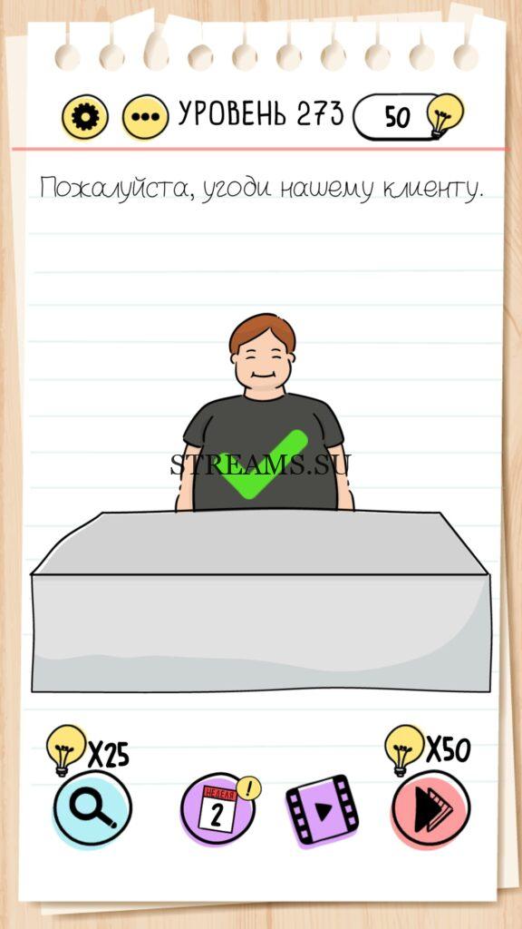 Пожалуйста, угоди нашему клиенту. Уровень 273 — Brain Test — Это самая популярная головоломка, в которой вам предстоит разгадывать непростые задачки. Нужно будет искать нестандартные решения. Название игры говорит само за себя (Тест мозга). С её помощью вы сможете повысить свой IQ, и интеллект. Иногда ответ может быть очень прост. Вы можете играть в компании друзей или родных. Брейн Тест, это отличный способ провести время с пользой и узнать насколько ты умный. Но если вы не можете решить один или несколько уровней, то воспользуйтесь подсказками с нашего сайта.