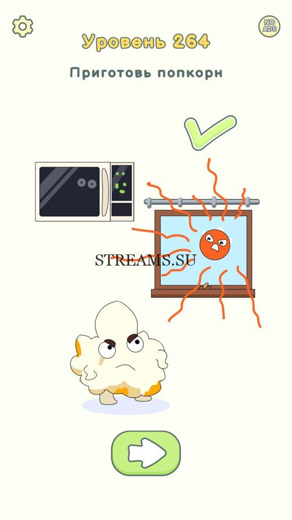 Приготовь попкорн. Уровень 264 — DOP 2: Delete One Part. Вы готовы к продолжению первой части игры? Тогда вперед! Эта игра DOP 2 (Расшифровка: Delete One Part) , которая отличается от первой части тем, что здесь нам нужно будет не дорисовывать предметы, а удалять или стирать их. Вас ждет множество хитроумных и интересных уровней. На первом этапе нам будут подсказывать, что нужно удали, но потом становится всё тяжелее и тяжелее решать головоломки. Разработчики постарались сделать игру привлекательной. Геймплей заставит вас просидеть за игрой очень долго. Красивая графика исполнения. Тренировка мозга и многое другое, всё это ждет нас в замечательной головоломке DOP 2. Если не получается пройти уровень, или зашли в тупик, то вы можете найти ответ на любой уровень на нашем сайте STREAMS.SU! Ответ на этот уровень находиться чуть ниже..