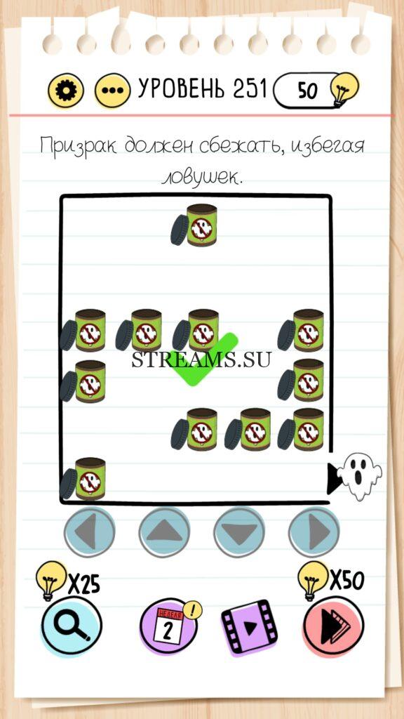 Призрак должен сбежать, избегая ловушек. Уровень 251 — Brain Test — Это самая популярная головоломка, в которой вам предстоит разгадывать непростые задачки. Нужно будет искать нестандартные решения. Название игры говорит само за себя (Тест мозга). С её помощью вы сможете повысить свой IQ, и интеллект. Иногда ответ может быть очень прост. Вы можете играть в компании друзей или родных. Брейн Тест, это отличный способ провести время с пользой и узнать насколько ты умный. Но если вы не можете решить один или несколько уровней, то воспользуйтесь подсказками с нашего сайта.