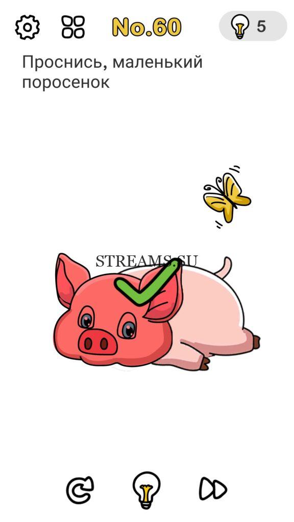 Проснись, маленький поросенок. Уровень 60 — Brain Out: Ответ на этот уровень находится чуть ниже. Всегда было интересно узнать каков твой IQ? Эта игра поможет тебе узнать ответ на этот вопрос! В ней встречаются как логические загадки, так и не очень. С помощью этой интересной головоломки вы сможете развить нестандартное мышление, креативность, воображение а также улучшить способность запоминать. Некоторые решения задач, могут показаться абсурдными. Играйте в Brain Out с друзьями и родственниками. А если у вас не получается пройти один или несколько уровней, вы можете воспользоваться подсказками с нашего сайта.