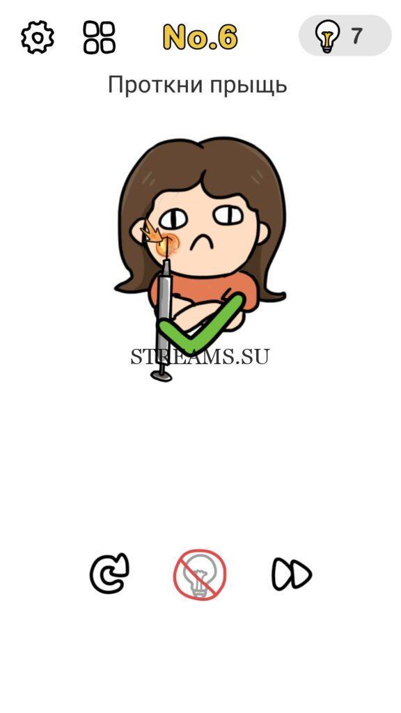 Проткни прыщ. (Победи их всех) Уровень 6 — Brain Out: Ответ на этот уровень находится чуть ниже. Всегда было интересно узнать каков твой IQ? Эта игра поможет тебе узнать ответ на этот вопрос! В ней встречаются как логические загадки, так и не очень. С помощью этой интересной головоломки вы сможете развить нестандартное мышление, креативность, воображение а также улучшить способность запоминать. Некоторые решения задач, могут показаться абсурдными. Играйте в Brain Out с друзьями и родственниками. А если у вас не получается пройти один или несколько уровней, вы можете воспользоваться подсказками с нашего сайта.