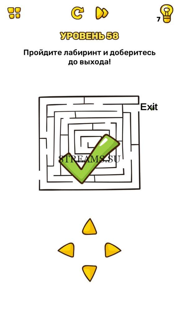 Пройдите лабиринт и доберитесь до выхода! Уровень 58 — Brain Blow: Тест на гениальность — Ответ на этот уровень находится под фото. Очередная игра от популярных разработчиков головоломок CASUAL AZUR GAMES. Если вы хотите взорвать свой мозг и развить навыки нестандартного мышления, тогда игра Брейн Блоу определенно вам понравится. Если не получается решить задание, то попробуйте включить нестандартное мышление, тряхнуть телефон, погладить его или использовать больше пальцев. Эта игра способна развить в вас навыки следопыта, креативность и прокачать ваш IQ. Но, а если все-же не получается пройти уровень, найдите правильное решение на нашем сайте.