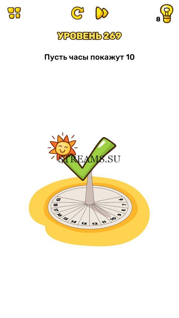 Пусть часы покажут 10. Уровень 269 — Brain Blow: Тест на гениальность — Ответ на этот уровень находится под фото. Очередная игра от популярных разработчиков головоломок CASUAL AZUR GAMES. Если вы хотите взорвать свой мозг и развить навыки нестандартного мышления, тогда игра Брейн Блоу определенно вам понравится. Если не получается решить задание, то попробуйте включить нестандартное мышление, тряхнуть телефон, погладить его или использовать больше пальцев. Эта игра способна развить в вас навыки следопыта, креативность и прокачать ваш IQ. Но, а если все-же не получается пройти уровень, найдите правильное решение на нашем сайте.