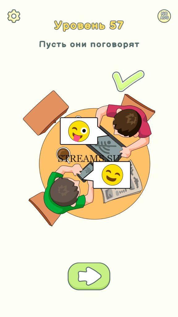 Пусть они поговорят. Уровень 57 — DOP 2: Delete One Part. Вы готовы к продолжению первой части игры? Тогда вперед! Эта игра DOP 2 (Расшифровка: Delete One Part) , которая отличается от первой части тем, что здесь нам нужно будет не дорисовывать предметы, а удалять или стирать их. Вас ждет множество хитроумных и интересных уровней. На первом этапе нам будут подсказывать, что нужно удали, но потом становится всё тяжелее и тяжелее решать головоломки. Разработчики постарались сделать игру привлекательной. Геймплей заставит вас просидеть за игрой очень долго. Красивая графика исполнения. Тренировка мозга и многое другое, всё это ждет нас в замечательной головоломке DOP 2. Если не получается пройти уровень, или зашли в тупик, то вы можете найти ответ на любой уровень на нашем сайте STREAMS.SU! Ответ на этот уровень находиться чуть ниже..