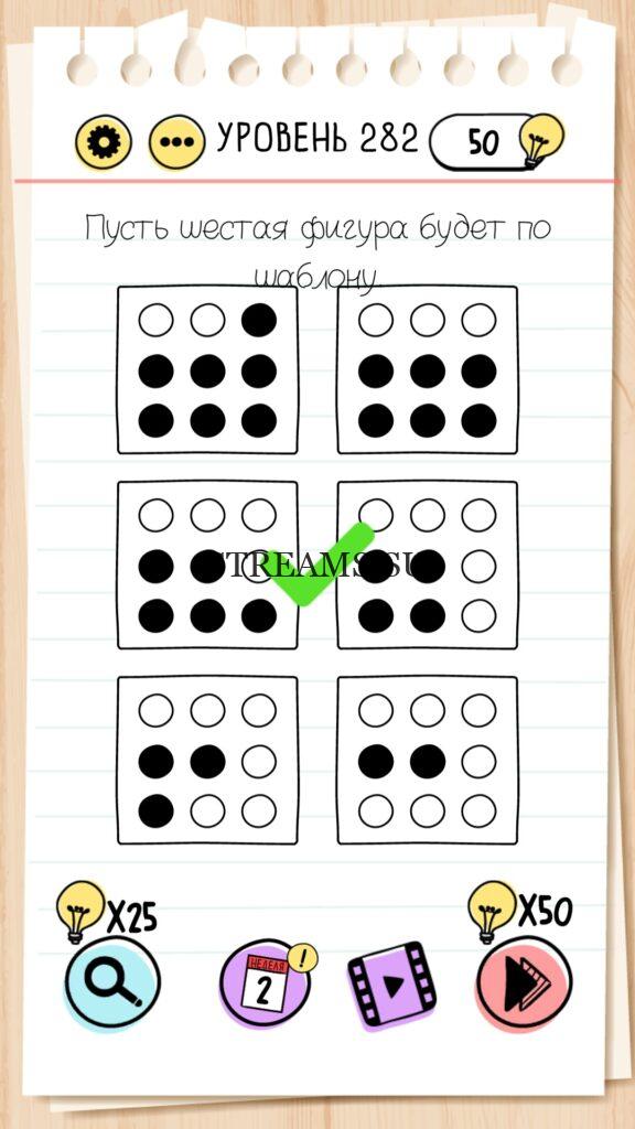 Пусть шестая фигура будет по шаблону. Уровень 282 — Brain Test — Это самая популярная головоломка, в которой вам предстоит разгадывать непростые задачки. Нужно будет искать нестандартные решения. Название игры говорит само за себя (Тест мозга). С её помощью вы сможете повысить свой IQ, и интеллект. Иногда ответ может быть очень прост. Вы можете играть в компании друзей или родных. Брейн Тест, это отличный способ провести время с пользой и узнать насколько ты умный. Но если вы не можете решить один или несколько уровней, то воспользуйтесь подсказками с нашего сайта.