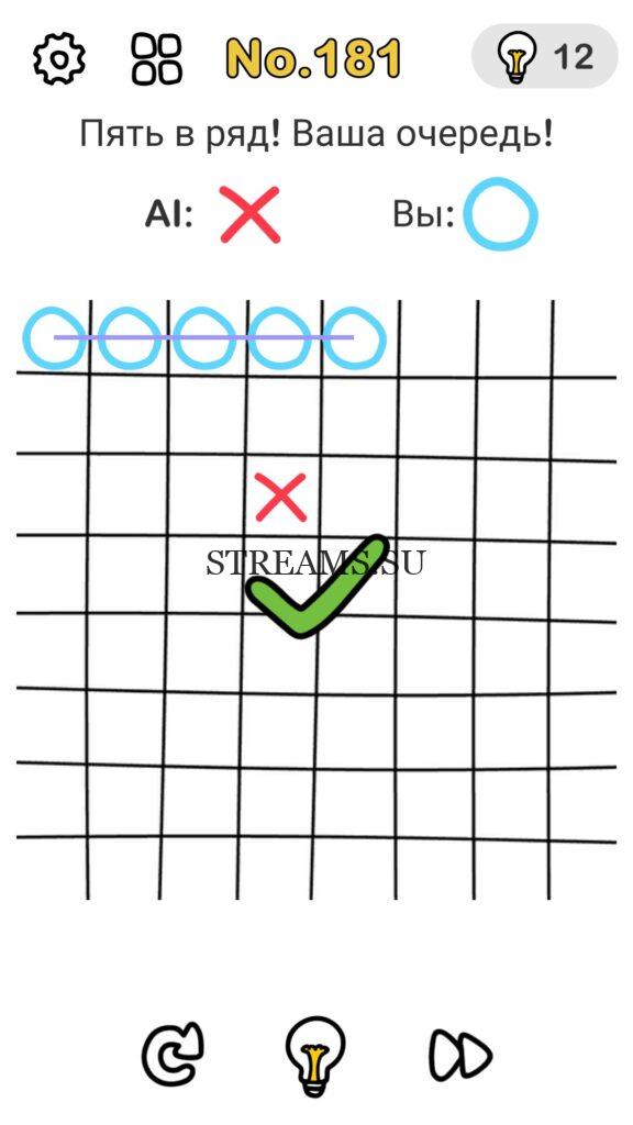 Пять в ряд! Ваша очередь! Уровень 181 — Brain Out: Ответ на этот уровень находится чуть ниже. Всегда было интересно узнать каков твой IQ? Эта игра поможет тебе узнать ответ на этот вопрос! В ней встречаются как логические загадки, так и не очень. С помощью этой интересной головоломки вы сможете развить нестандартное мышление, креативность, воображение а также улучшить способность запоминать. Некоторые решения задач, могут показаться абсурдными. Играйте в Brain Out с друзьями и родственниками. А если у вас не получается пройти один или несколько уровней, вы можете воспользоваться подсказками с нашего сайта.