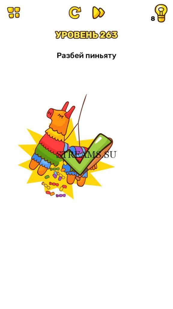 Разбейте пиньяту. Уровень 263 — Brain Blow: Тест на гениальность — Ответ на этот уровень находится под фото. Очередная игра от популярных разработчиков головоломок CASUAL AZUR GAMES. Если вы хотите взорвать свой мозг и развить навыки нестандартного мышления, тогда игра Брейн Блоу определенно вам понравится. Если не получается решить задание, то попробуйте включить нестандартное мышление, тряхнуть телефон, погладить его или использовать больше пальцев. Эта игра способна развить в вас навыки следопыта, креативность и прокачать ваш IQ. Но, а если все-же не получается пройти уровень, найдите правильное решение на нашем сайте.
