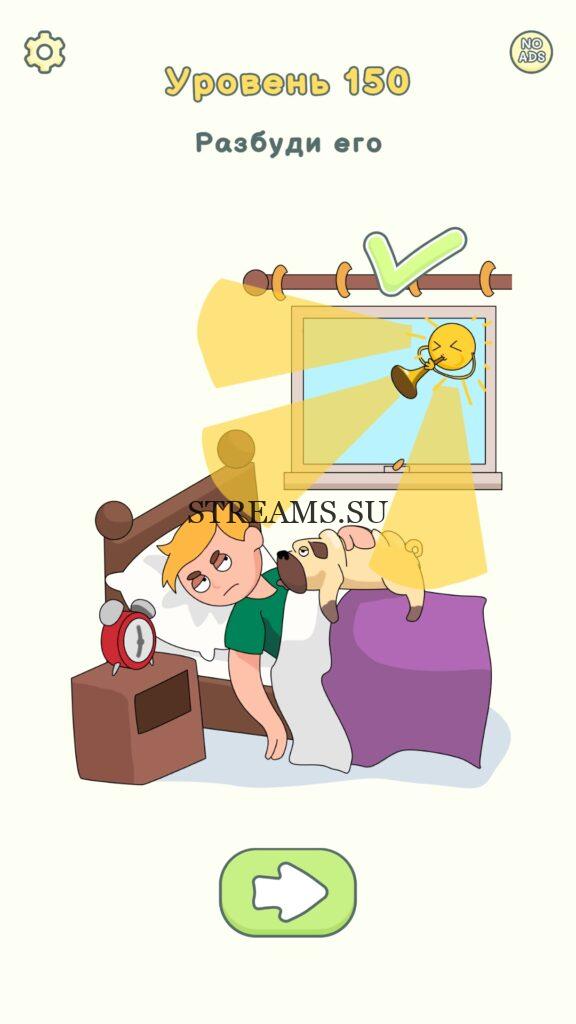 Разбуди его. Уровень 150 — DOP 2: Delete One Part. Вы готовы к продолжению первой части игры? Тогда вперед! Эта игра DOP 2 (Расшифровка: Delete One Part) , которая отличается от первой части тем, что здесь нам нужно будет не дорисовывать предметы, а удалять или стирать их. Вас ждет множество хитроумных и интересных уровней. На первом этапе нам будут подсказывать, что нужно удали, но потом становится всё тяжелее и тяжелее решать головоломки. Разработчики постарались сделать игру привлекательной. Геймплей заставит вас просидеть за игрой очень долго. Красивая графика исполнения. Тренировка мозга и многое другое, всё это ждет нас в замечательной головоломке DOP 2. Если не получается пройти уровень, или зашли в тупик, то вы можете найти ответ на любой уровень на нашем сайте STREAMS.SU! Ответ на этот уровень находиться чуть ниже..