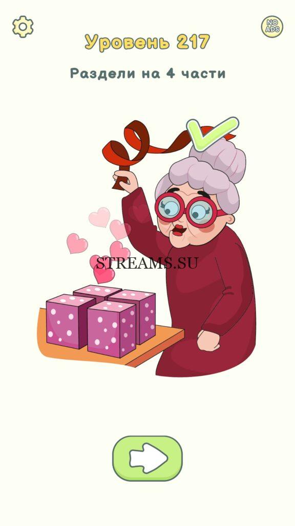 Раздели на 4 части. Уровень 217 — DOP 2: Delete One Part. Вы готовы к продолжению первой части игры? Тогда вперед! Эта игра DOP 2 (Расшифровка: Delete One Part) , которая отличается от первой части тем, что здесь нам нужно будет не дорисовывать предметы, а удалять или стирать их. Вас ждет множество хитроумных и интересных уровней. На первом этапе нам будут подсказывать, что нужно удали, но потом становится всё тяжелее и тяжелее решать головоломки. Разработчики постарались сделать игру привлекательной. Геймплей заставит вас просидеть за игрой очень долго. Красивая графика исполнения. Тренировка мозга и многое другое, всё это ждет нас в замечательной головоломке DOP 2. Если не получается пройти уровень, или зашли в тупик, то вы можете найти ответ на любой уровень на нашем сайте STREAMS.SU! Ответ на этот уровень находиться чуть ниже..