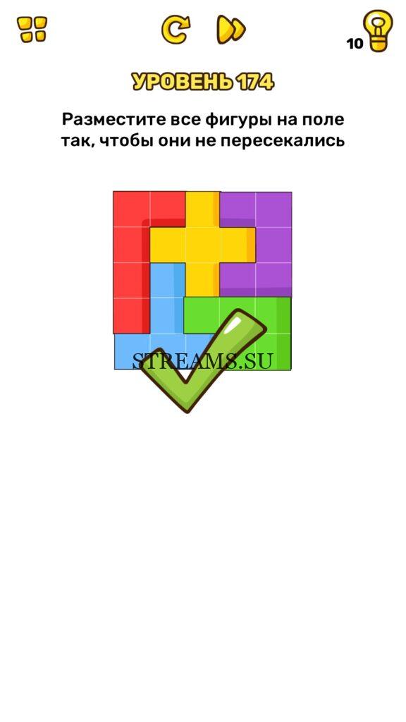 Разместите все фигуры на поле так, чтобы они не пересекались. Уровень 174 — Brain Blow: Тест на гениальность — Ответ на этот уровень находится под фото. Очередная игра от популярных разработчиков головоломок CASUAL AZUR GAMES. Если вы хотите взорвать свой мозг и развить навыки нестандартного мышления, тогда игра Брейн Блоу определенно вам понравится. Если не получается решить задание, то попробуйте включить нестандартное мышление, тряхнуть телефон, погладить его или использовать больше пальцев. Эта игра способна развить в вас навыки следопыта, креативность и прокачать ваш IQ. Но, а если все-же не получается пройти уровень, найдите правильное решение на нашем сайте.