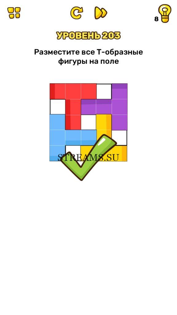 Разместите все Т-образные фигуры на поле. Уровень 203 — Brain Blow: Тест на гениальность — Ответ на этот уровень находится под фото. Очередная игра от популярных разработчиков головоломок CASUAL AZUR GAMES. Если вы хотите взорвать свой мозг и развить навыки нестандартного мышления, тогда игра Брейн Блоу определенно вам понравится. Если не получается решить задание, то попробуйте включить нестандартное мышление, тряхнуть телефон, погладить его или использовать больше пальцев. Эта игра способна развить в вас навыки следопыта, креативность и прокачать ваш IQ. Но, а если все-же не получается пройти уровень, найдите правильное решение на нашем сайте.