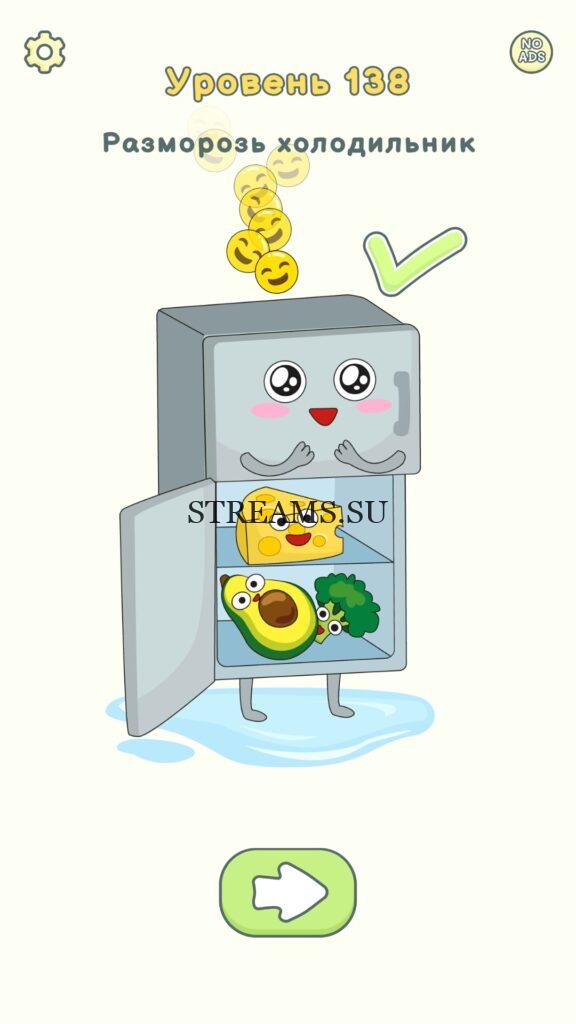 Разморозь холодильник. Уровень 138 — DOP 2: Delete One Part. Вы готовы к продолжению первой части игры? Тогда вперед! Эта игра DOP 2 (Расшифровка: Delete One Part) , которая отличается от первой части тем, что здесь нам нужно будет не дорисовывать предметы, а удалять или стирать их. Вас ждет множество хитроумных и интересных уровней. На первом этапе нам будут подсказывать, что нужно удали, но потом становится всё тяжелее и тяжелее решать головоломки. Разработчики постарались сделать игру привлекательной. Геймплей заставит вас просидеть за игрой очень долго. Красивая графика исполнения. Тренировка мозга и многое другое, всё это ждет нас в замечательной головоломке DOP 2. Если не получается пройти уровень, или зашли в тупик, то вы можете найти ответ на любой уровень на нашем сайте STREAMS.SU! Ответ на этот уровень находиться чуть ниже..
