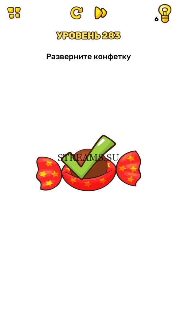 Разверните конфетку. Уровень 283 — Brain Blow: Тест на гениальность — Ответ на этот уровень находится под фото. Очередная игра от популярных разработчиков головоломок CASUAL AZUR GAMES. Если вы хотите взорвать свой мозг и развить навыки нестандартного мышления, тогда игра Брейн Блоу определенно вам понравится. Если не получается решить задание, то попробуйте включить нестандартное мышление, тряхнуть телефон, погладить его или использовать больше пальцев. Эта игра способна развить в вас навыки следопыта, креативность и прокачать ваш IQ. Но, а если все-же не получается пройти уровень, найдите правильное решение на нашем сайте.
