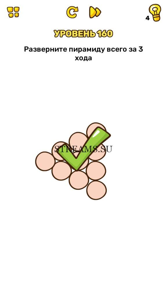 Разверните пирамиду всего за 3 хода. Уровень 160 — Brain Blow: Тест на гениальность — Ответ на этот уровень находится под фото. Очередная игра от популярных разработчиков головоломок CASUAL AZUR GAMES. Если вы хотите взорвать свой мозг и развить навыки нестандартного мышления, тогда игра Брейн Блоу определенно вам понравится. Если не получается решить задание, то попробуйте включить нестандартное мышление, тряхнуть телефон, погладить его или использовать больше пальцев. Эта игра способна развить в вас навыки следопыта, креативность и прокачать ваш IQ. Но, а если все-же не получается пройти уровень, найдите правильное решение на нашем сайте.