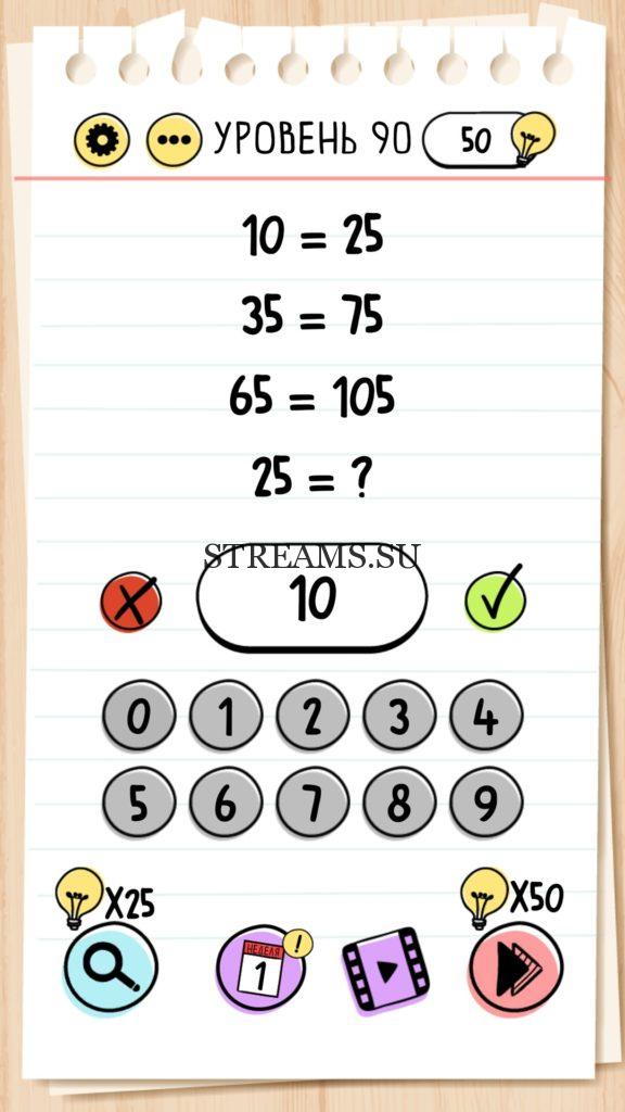 Решите равенство. Уровень 90 — Brain Test — Это самая популярная головоломка, в которой вам предстоит разгадывать непростые задачки. Нужно будет искать нестандартные решения. Название игры говорит само за себя (Тест мозга). С её помощью вы сможете повысить свой IQ, и интеллект. Иногда ответ может быть очень прост. Вы можете играть в компании друзей или родных. Брейн Тест, это отличный способ провести время с пользой и узнать насколько ты умный. Но если вы не можете решить один или несколько уровней, то воспользуйтесь подсказками с нашего сайта.