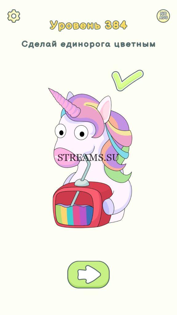 Сделай единорога цветным. Уровень 384 — DOP 2: Delete One Part. Вы готовы к продолжению первой части игры? Тогда вперед! Эта игра DOP 2 (Расшифровка: Delete One Part) , которая отличается от первой части тем, что здесь нам нужно будет не дорисовывать предметы, а удалять или стирать их. Вас ждет множество хитроумных и интересных уровней. На первом этапе нам будут подсказывать, что нужно удали, но потом становится всё тяжелее и тяжелее решать головоломки. Разработчики постарались сделать игру привлекательной. Геймплей заставит вас просидеть за игрой очень долго. Красивая графика исполнения. Тренировка мозга и многое другое, всё это ждет нас в замечательной головоломке DOP 2. Если не получается пройти уровень, или зашли в тупик, то вы можете найти ответ на любой уровень на нашем сайте STREAMS.SU! Ответ на этот уровень находиться чуть ниже..