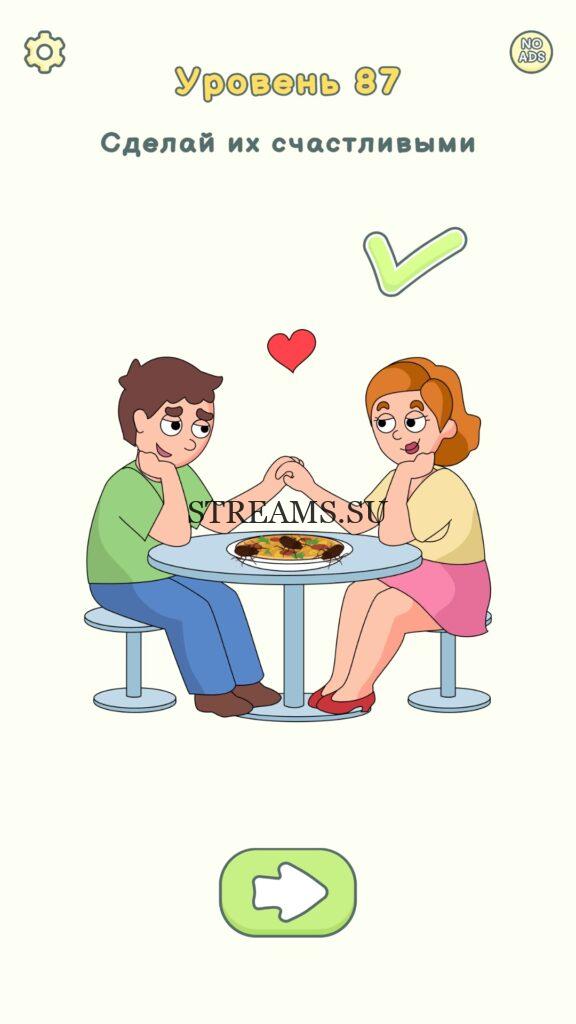 Сделай их счастливыми. Уровень 87 — DOP 2: Delete One Part. Вы готовы к продолжению первой части игры? Тогда вперед! Эта игра DOP 2 (Расшифровка: Delete One Part) , которая отличается от первой части тем, что здесь нам нужно будет не дорисовывать предметы, а удалять или стирать их. Вас ждет множество хитроумных и интересных уровней. На первом этапе нам будут подсказывать, что нужно удали, но потом становится всё тяжелее и тяжелее решать головоломки. Разработчики постарались сделать игру привлекательной. Геймплей заставит вас просидеть за игрой очень долго. Красивая графика исполнения. Тренировка мозга и многое другое, всё это ждет нас в замечательной головоломке DOP 2. Если не получается пройти уровень, или зашли в тупик, то вы можете найти ответ на любой уровень на нашем сайте STREAMS.SU! Ответ на этот уровень находиться чуть ниже..