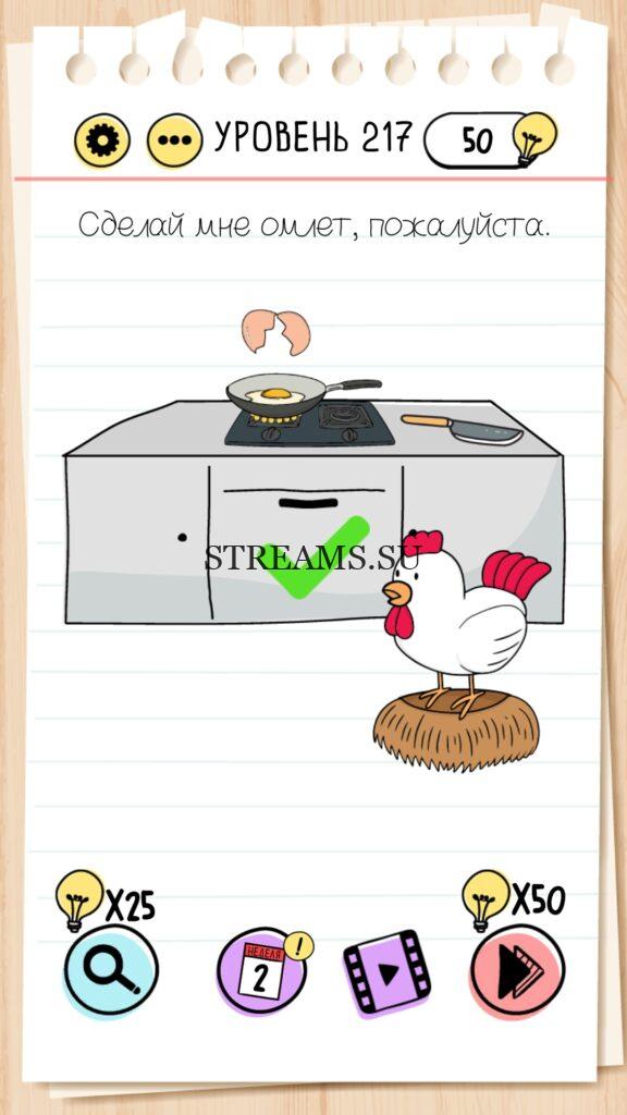 Сделай мне омлет, пожалуйста. Уровень 217 — Brain Test — Это самая популярная головоломка, в которой вам предстоит разгадывать непростые задачки. Нужно будет искать нестандартные решения. Название игры говорит само за себя (Тест мозга). С её помощью вы сможете повысить свой IQ, и интеллект. Иногда ответ может быть очень прост. Вы можете играть в компании друзей или родных. Брейн Тест, это отличный способ провести время с пользой и узнать насколько ты умный. Но если вы не можете решить один или несколько уровней, то воспользуйтесь подсказками с нашего сайта.