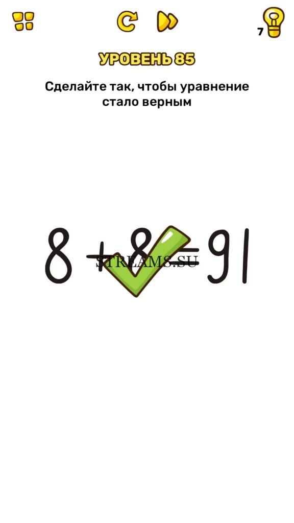 Сделайте так, чтобы уравнение стало верным. Уровень 85 — Brain Blow: Тест на гениальность — Ответ на этот уровень находится под фото. Очередная игра от популярных разработчиков головоломок CASUAL AZUR GAMES. Если вы хотите взорвать свой мозг и развить навыки нестандартного мышления, тогда игра Брейн Блоу определенно вам понравится. Если не получается решить задание, то попробуйте включить нестандартное мышление, тряхнуть телефон, погладить его или использовать больше пальцев. Эта игра способна развить в вас навыки следопыта, креативность и прокачать ваш IQ. Но, а если все-же не получается пройти уровень, найдите правильное решение на нашем сайте.
