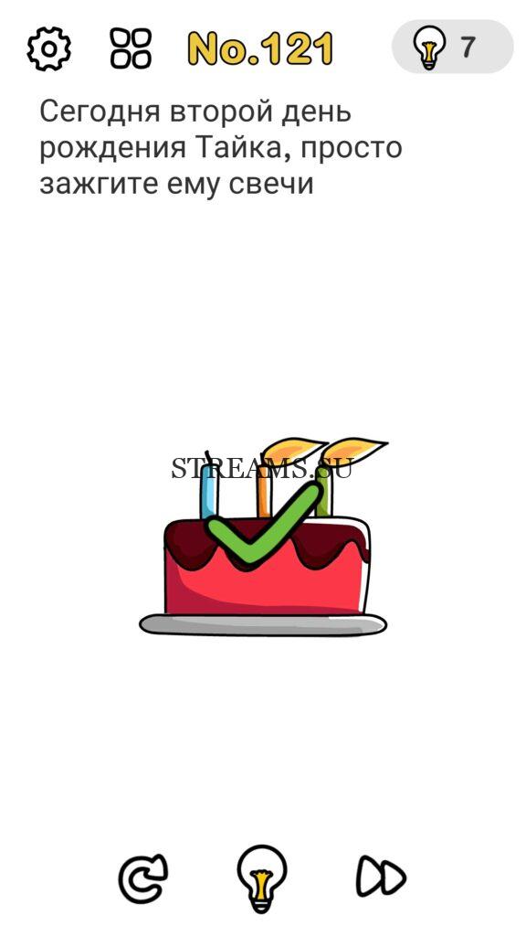 Сегодня второй день рождения Тайка, просто зажгите ему свечи. Уровень 121 — Brain Out: Ответ на этот уровень находится чуть ниже. Всегда было интересно узнать каков твой IQ? Эта игра поможет тебе узнать ответ на этот вопрос! В ней встречаются как логические загадки, так и не очень. С помощью этой интересной головоломки вы сможете развить нестандартное мышление, креативность, воображение а также улучшить способность запоминать. Некоторые решения задач, могут показаться абсурдными. Играйте в Brain Out с друзьями и родственниками. А если у вас не получается пройти один или несколько уровней, вы можете воспользоваться подсказками с нашего сайта.