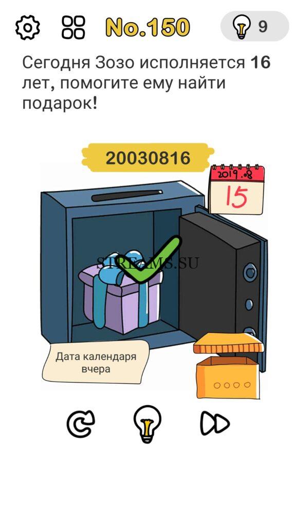 Сегодня Зозо исполняется 16 лет, помогите ему найти подарок! Уровень 150 — Brain Out: Ответ на этот уровень находится чуть ниже. Всегда было интересно узнать каков твой IQ? Эта игра поможет тебе узнать ответ на этот вопрос! В ней встречаются как логические загадки, так и не очень. С помощью этой интересной головоломки вы сможете развить нестандартное мышление, креативность, воображение а также улучшить способность запоминать. Некоторые решения задач, могут показаться абсурдными. Играйте в Brain Out с друзьями и родственниками. А если у вас не получается пройти один или несколько уровней, вы можете воспользоваться подсказками с нашего сайта.