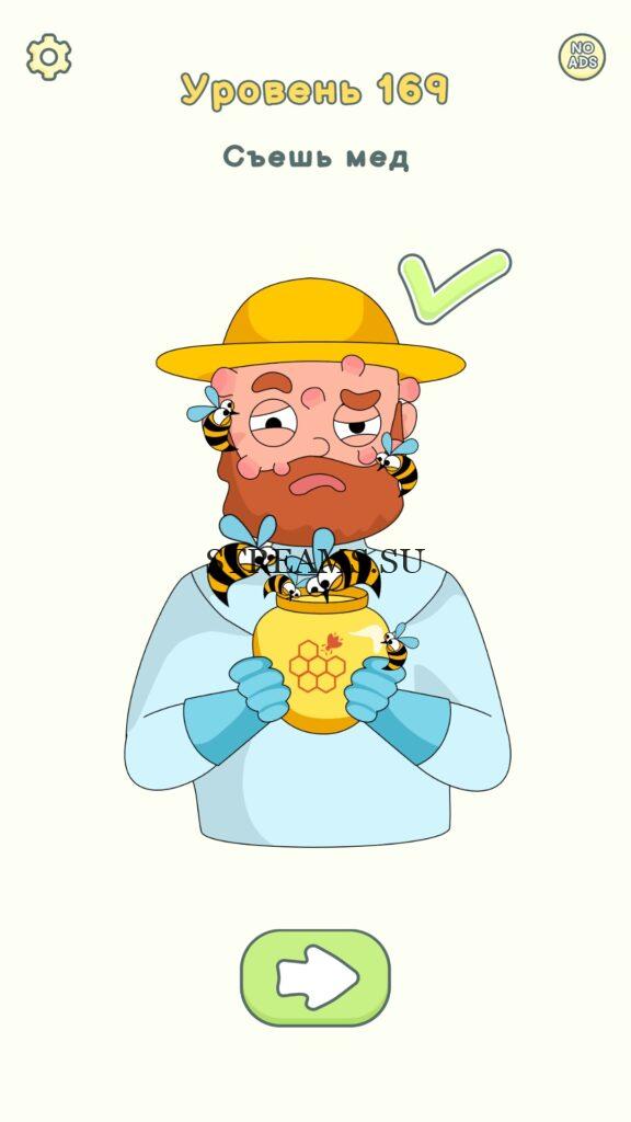 Съешь мед. Уровень 169 — DOP 2: Delete One Part. Вы готовы к продолжению первой части игры? Тогда вперед! Эта игра DOP 2 (Расшифровка: Delete One Part) , которая отличается от первой части тем, что здесь нам нужно будет не дорисовывать предметы, а удалять или стирать их. Вас ждет множество хитроумных и интересных уровней. На первом этапе нам будут подсказывать, что нужно удали, но потом становится всё тяжелее и тяжелее решать головоломки. Разработчики постарались сделать игру привлекательной. Геймплей заставит вас просидеть за игрой очень долго. Красивая графика исполнения. Тренировка мозга и многое другое, всё это ждет нас в замечательной головоломке DOP 2. Если не получается пройти уровень, или зашли в тупик, то вы можете найти ответ на любой уровень на нашем сайте STREAMS.SU! Ответ на этот уровень находиться чуть ниже..