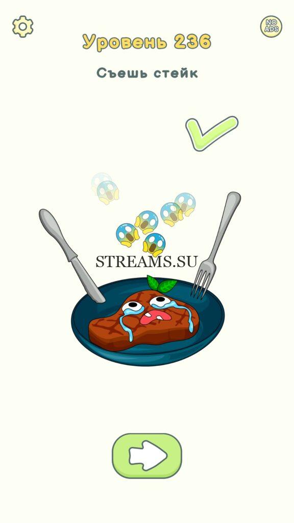 Съешь стейк. Уровень 236 — DOP 2: Delete One Part. Вы готовы к продолжению первой части игры? Тогда вперед! Эта игра DOP 2 (Расшифровка: Delete One Part) , которая отличается от первой части тем, что здесь нам нужно будет не дорисовывать предметы, а удалять или стирать их. Вас ждет множество хитроумных и интересных уровней. На первом этапе нам будут подсказывать, что нужно удали, но потом становится всё тяжелее и тяжелее решать головоломки. Разработчики постарались сделать игру привлекательной. Геймплей заставит вас просидеть за игрой очень долго. Красивая графика исполнения. Тренировка мозга и многое другое, всё это ждет нас в замечательной головоломке DOP 2. Если не получается пройти уровень, или зашли в тупик, то вы можете найти ответ на любой уровень на нашем сайте STREAMS.SU! Ответ на этот уровень находиться чуть ниже..