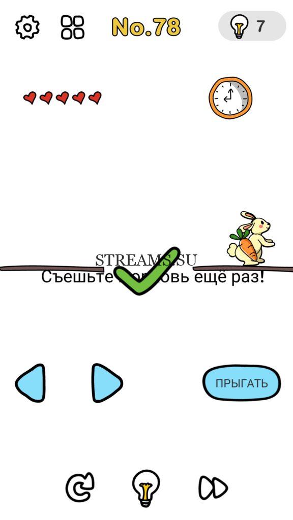 Съешьте морковь ещё раз! Уровень 78 — Brain Out: Ответ на этот уровень находится чуть ниже. Всегда было интересно узнать каков твой IQ? Эта игра поможет тебе узнать ответ на этот вопрос! В ней встречаются как логические загадки, так и не очень. С помощью этой интересной головоломки вы сможете развить нестандартное мышление, креативность, воображение а также улучшить способность запоминать. Некоторые решения задач, могут показаться абсурдными. Играйте в Brain Out с друзьями и родственниками. А если у вас не получается пройти один или несколько уровней, вы можете воспользоваться подсказками с нашего сайта.