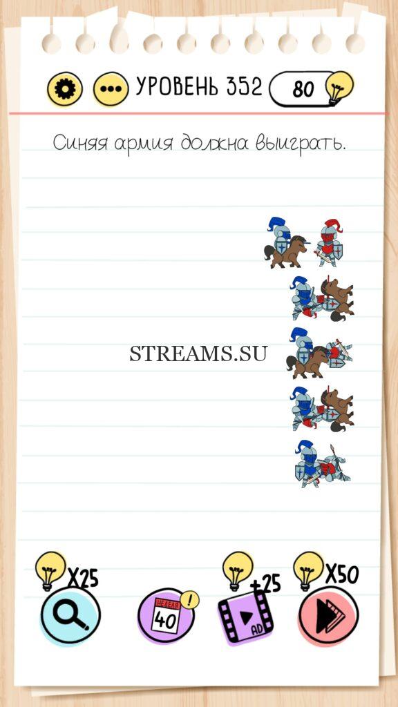 Синяя армия должна выиграть. Уровень 352 — Brain Test — Это самая популярная головоломка, в которой вам предстоит разгадывать непростые задачки. Нужно будет искать нестандартные решения. Название игры говорит само за себя (Тест мозга). С её помощью вы сможете повысить свой IQ, и интеллект. Иногда ответ может быть очень прост. Вы можете играть в компании друзей или родных. Брейн Тест, это отличный способ провести время с пользой и узнать насколько ты умный. Но если вы не можете решить один или несколько уровней, то воспользуйтесь подсказками с нашего сайта.