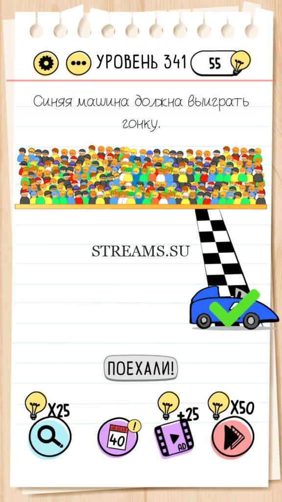 Синяя машинка должна выиграть гонку. Уровень 341 — Brain Test — Это самая популярная головоломка, в которой вам предстоит разгадывать непростые задачки. Нужно будет искать нестандартные решения. Название игры говорит само за себя (Тест мозга). С её помощью вы сможете повысить свой IQ, и интеллект. Иногда ответ может быть очень прост. Вы можете играть в компании друзей или родных. Брейн Тест, это отличный способ провести время с пользой и узнать насколько ты умный. Но если вы не можете решить один или несколько уровней, то воспользуйтесь подсказками с нашего сайта.