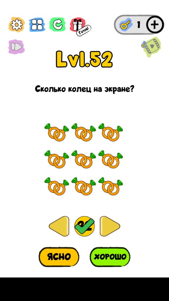 Сколько колец на экране? 52 уровень Trick Me: логические головоломки — Это игра созданная в виде викторины. Каждый новый уровень отличается от предыдущего, что делает игровой процесс затягивающим и интересным. Если ты хочешь узнать насколько ты умный, тогда эта игра точно для тебя! Trick Me поможет тебе развить нестандартное мышление, и повысить свой IQ. В этой игре уже есть 236 уровней, которые постоянно обновляются и пополняются. Но если застрял на одном или нескольких уровнях, и не можешь их пройти, то наш сайт придет на помощь, у нас есть все ответы на уровни игры Trick Me.