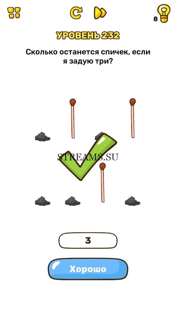 Сколько останется спичек, если я задую три? Уровень 232 — Brain Blow: Тест на гениальность — Ответ на этот уровень находится под фото. Очередная игра от популярных разработчиков головоломок CASUAL AZUR GAMES. Если вы хотите взорвать свой мозг и развить навыки нестандартного мышления, тогда игра Брейн Блоу определенно вам понравится. Если не получается решить задание, то попробуйте включить нестандартное мышление, тряхнуть телефон, погладить его или использовать больше пальцев. Эта игра способна развить в вас навыки следопыта, креативность и прокачать ваш IQ. Но, а если все-же не получается пройти уровень, найдите правильное решение на нашем сайте.