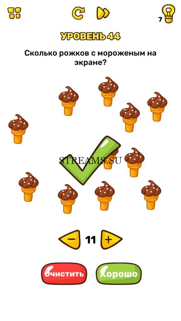 Сколько рожков с мороженым на экране? Уровень 44 — Brain Blow: Тест на гениальность — Ответ на этот уровень находится под фото. Очередная игра от популярных разработчиков головоломок CASUAL AZUR GAMES. Если вы хотите взорвать свой мозг и развить навыки нестандартного мышления, тогда игра Брейн Блоу определенно вам понравится. Если не получается решить задание, то попробуйте включить нестандартное мышление, тряхнуть телефон, погладить его или использовать больше пальцев. Эта игра способна развить в вас навыки следопыта, креативность и прокачать ваш IQ. Но, а если все-же не получается пройти уровень, найдите правильное решение на нашем сайте.
